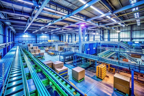 Modern package manufacturing facility with advanced machinery, conveyor belts, and product assembly lines