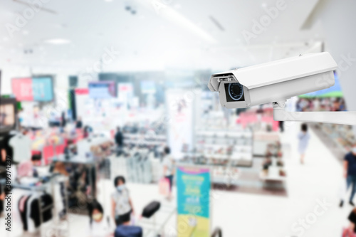 Modern public CCTV camera with blur interior shopping mall background. Recording cameras for monitoring all day and night. Concept of surveillance and monitoring with copy space.