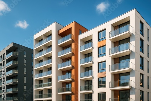 Modern Residential Buildings with Sleek Architecture Against a Clear Blue Sky: A Look at Contemporary Living Spaces in Urban Environments.