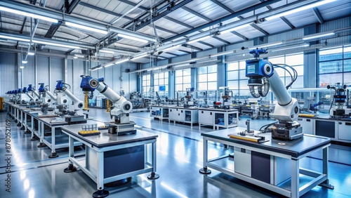 Modern robotic arms and machinery surround workbenches cluttered with wires, circuits, and microchips in a sleek, high-tech laboratory setting.