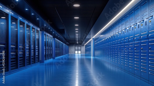 Modern server room data center with blue servers racks and network cables