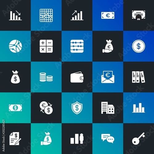 Modern Simple Set of business, money, charts Vector fill Icons. Contains such Icons as page, currency, cash, businessman and more on dark and gradient background. Fully Editable. Pixel Perfect.