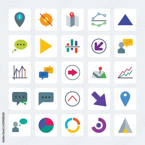 Modern Simple Set of location, arrows, charts, chat and messenger Vector flat Icons. .Contains such Icons as target, percentage, chat, pin and more on gray background. Fully Editable. Pixel Perfect