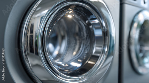 Modern sleek stainless steel front-loading washing machine drum reflecting ambient light in a minimalistic laundry room setting with a shallow depth of field