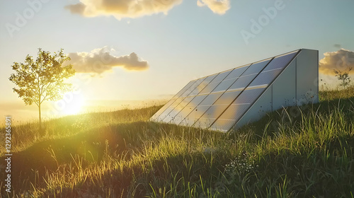 Modern Solar Panel Greenhouse on Hillside at Sunset