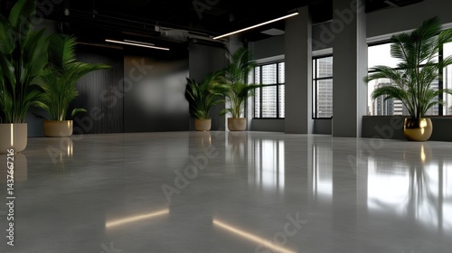 Modern, spacious open-plan office interior, featuring minimalist design, concrete floors, large windows, and lush greenery