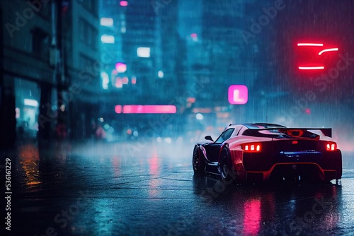 Modern sport car racing in the night at city streets with neon lights streaking by. Ai generated, is not base on any real image
