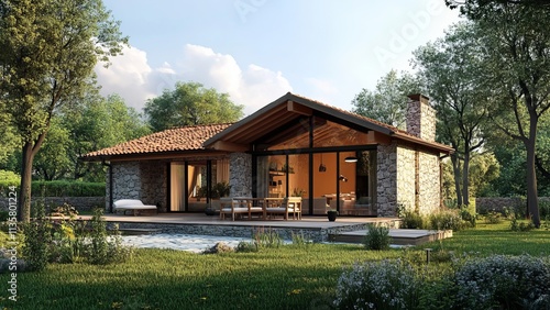 Modern stone cottage surrounded by lush greenery in a serene setting