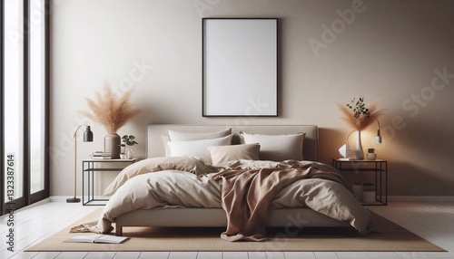 Modern stylish bedroom interior with empty frame, bed, minimalist design