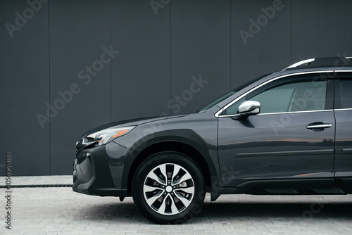 Modern subcompact crossover SUV, beautiful wheels, large chrome grille, gray color.