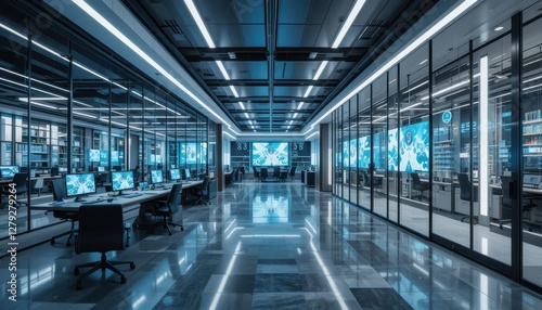 Modern Tech Office Interior with Sleek Design and Blue Lighting