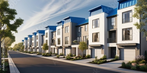 Modern townhouses, blue roofs, white facades, suburban neighborhood, tree-lined street, residential development, clear sky, architectural rendering, crisp details, sunny day, symmetrical design, row o