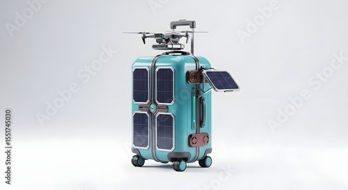 Modern Turquoise Suitcase with Solar Panels and Drone on White