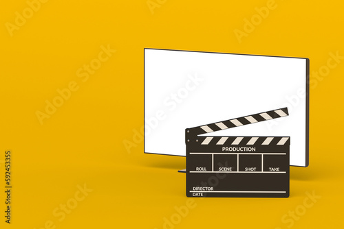 Modern tv with white isolated screen near clapper. Cinema concept. New film premiere. Cinematography industry. Copy space. 3d render