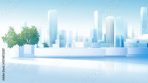 Modern Urban Landscape with Sleek Architecture Featuring Glass Buildings and Lush Green Plants in a Bright, Airy Interior - Ideal for Business and Growth Themes