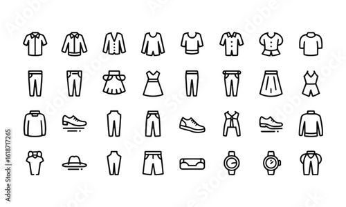 Modern vector illustration clothing and fashion accessories icons in black on a white background, shirts, pants, jackets, dresses, skirts, shoes, underwear, hats, and watches, easily editable.