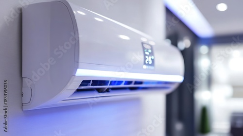 Modern wall-mounted air conditioner with blue LED lighting, displayed in a contemporary interior setting.