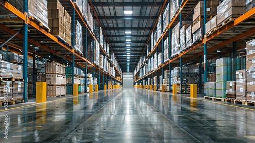 Modern warehouse storage with high shelves loaded with boxes, featuring polished concrete floor and advanced racking system.