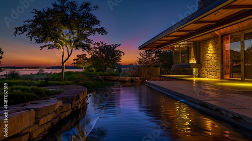 Modern Waterfront Building Lit At Dusk With Reflective Pool And Golden Lights
