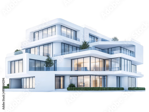 Modern white apartment building with large windows and green bushes.