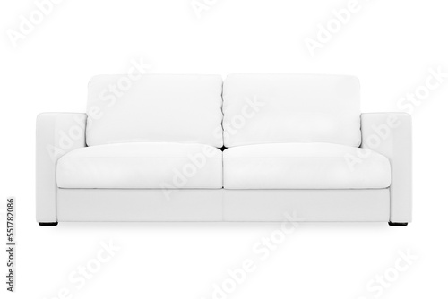 Modern white fabric two-seat sofa. Textile upholstery sofa on white background. Scandinavian interior. 3d rendering.
