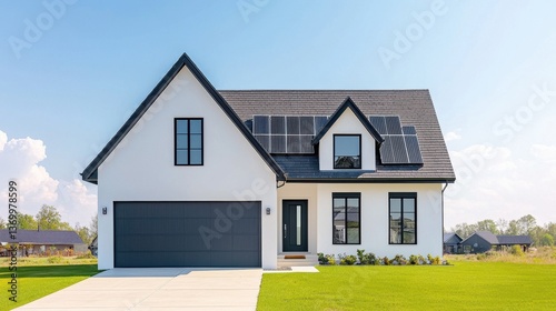 Modern White House with Solar Panels and Green Lawn Under Sky