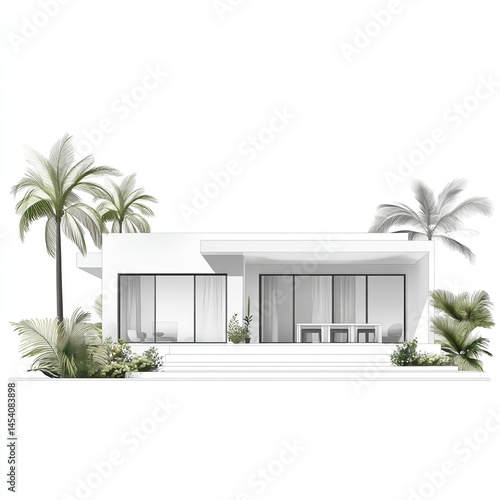Modern white house with tropical landscaping. Exterior view of a minimalist home with large windows, a patio and palm trees
