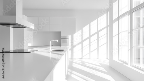 Modern White Kitchen Interior with Sunlight Streaming Through Large Windows