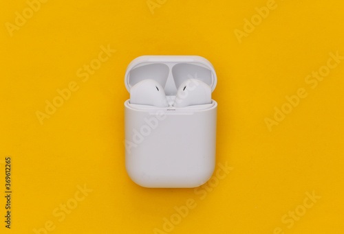 Modern wireless earphones with charging case on yellow background. Top view. Flat lay