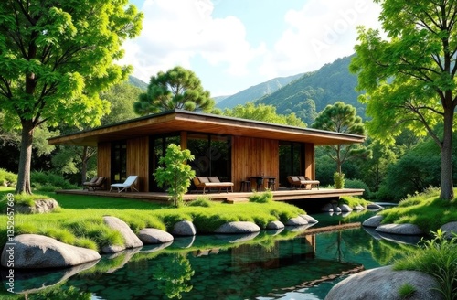 Modern wooden house by the river against the backdrop of mountains. Architecture of buildings.