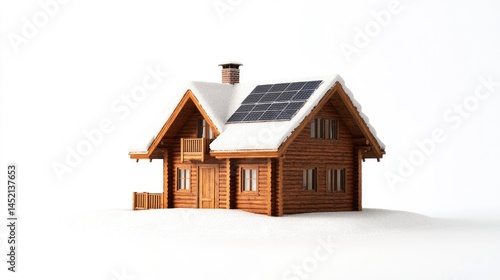 Modern wooden house with solar panels set against a white background in a snow-covered landscape