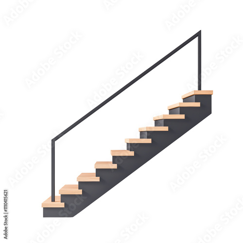 Modern wooden staircase with sleek black railing, perfect for contemporary interiors. isolated on transparent background