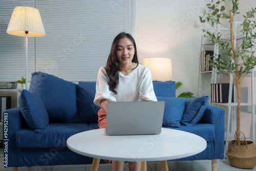 Modern working lifestyle Asian businesswoman sitting on sofa at home office working on laptop online using internet to get information, chat, to shop happily online.