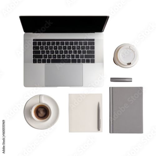 modern workspace featuring laptop, coffee cup, notebook, and pen, creating productive atmosphere for work or study