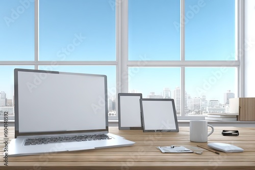 Modern workspace with laptop and tablets