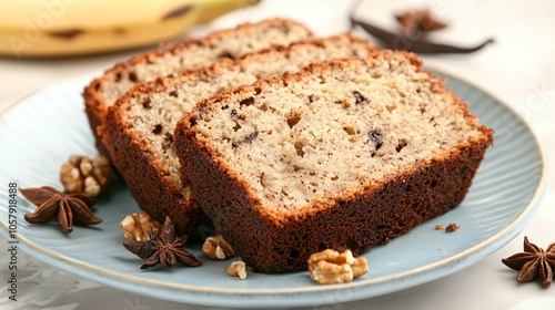 Moist banana bread slices with walnuts on a blue porcelain plate, decorated with vanilla beans and star anise