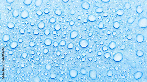 Moisturizing liquid blue drops on pastel background. Cosmetic toner or Water Drops. Hyaluronic serum Bubbles close-up. The texture of gel cream.