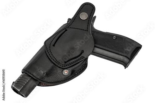 Molded leather holster with handgun. Isolated