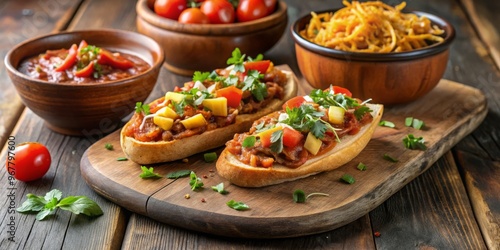 Molletes arranged artfully on a distressed wooden cutting board, paired with a small ceramic pot of chunky salsa and a handful of crispy tortilla strips