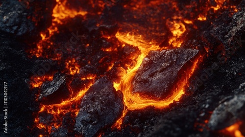 Molten iron flowing through rugged terrain, showcasing vibrant orange and yellow hues amidst dark, textured surfaces in a steel plant environment.