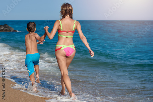 Mom and son are running along the sea shore. They are holding hands and moving away from the camera.