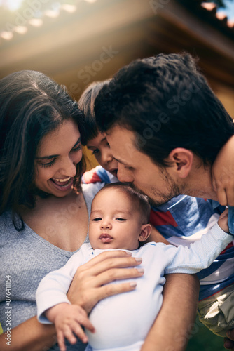 Mom, dad and baby bonding in backyard with care for happiness, love and vacation together outdoor. Family, children and smile in home garden with hug for support, relationship and relax in holiday