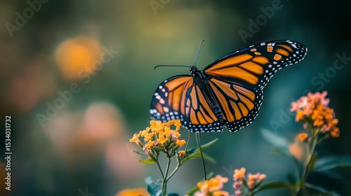 Monarch butterfly perched on yellow flowers with blurred background.
