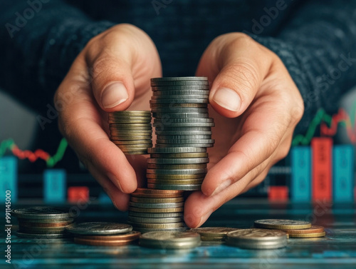 Money growth represented by hands holding a growing stack of coins, with financial charts and upward-pointing arrows in the background