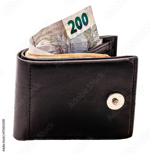 money wallet with Brazilian money, notes and real notes, on isolated white background