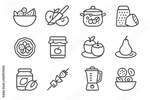 Monochrome kitchen icons: fruits, jar, blender, skewer, pot, bowl