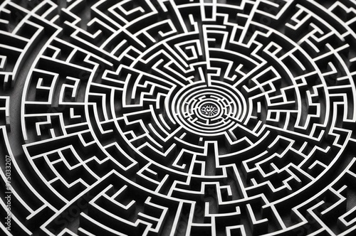 Monochrome maze design with intricate labyrinth patterns in black and white