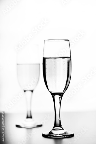 monochrome photo of champagne on white table on white background isolate