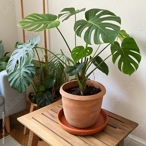 Monstera deliciosa plant in a terracotta pot on a wooden table indoors
