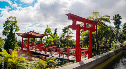 Monte Palace tropical garden with red pagoda, lakes and traditional buildings above the city of Funchal, popular tourist destination in Madeira island, Portugal